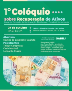 No próximo 27 de outubro de 2025, das 9h30 às 12h, será realizado o 1º Colóquio sobre Recuperação de Ativos, evento que reunirá especialistas para debater os principais desafios e perspectivas da recuperação de ativos, especialmente em fraudes internacionais, tema de enorme atualidade e impacto para o Direito e a economia global.